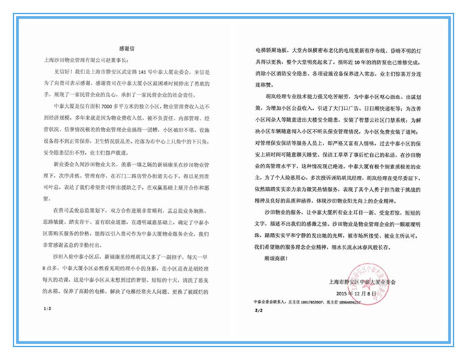 近日,公司收到一封來自上海中泰大廈業(yè)委會熱情洋溢的感謝信。來信對比新老物業(yè)截然不同的服務理念和方式,充分肯定了我司入駐中泰大廈的管理成果。欣喜之余,我們深感肩上的重任和壓力,業(yè)主的認可是我們不斷前行的動力,我們繼續(xù)秉承“用心服務,與業(yè)主共創(chuàng)美好家園”的服務理念,朝著打造“服務貼心、安全放心、生活舒心”的管理目標邁進。